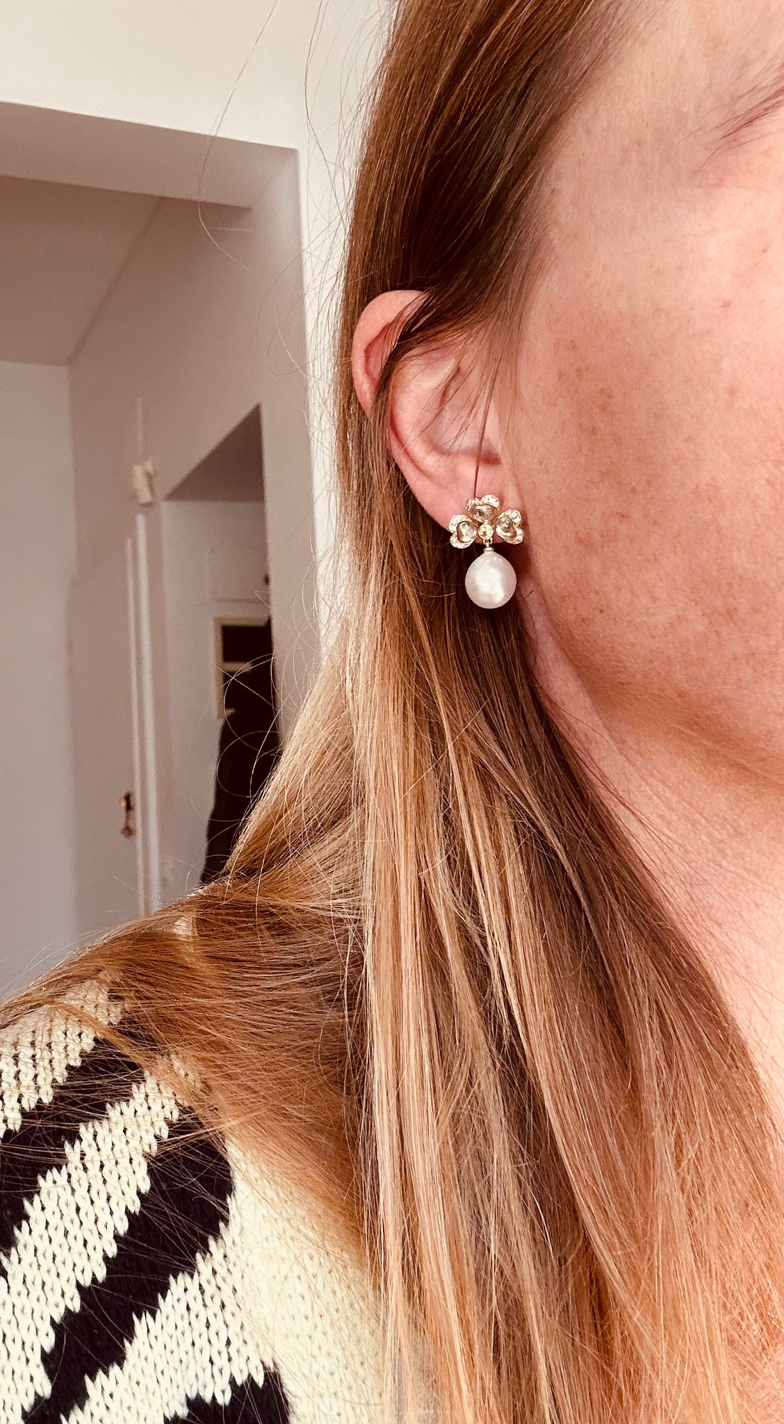 The clover-shaped upper body is adorned with 36 diamonds, totaling 0.15 ct, and sparkling colored and zyrcons. The drop-shaped cultured pearls (11 mm) add a touch of elegance. Length is 2.5 cm. 9,4 gr.