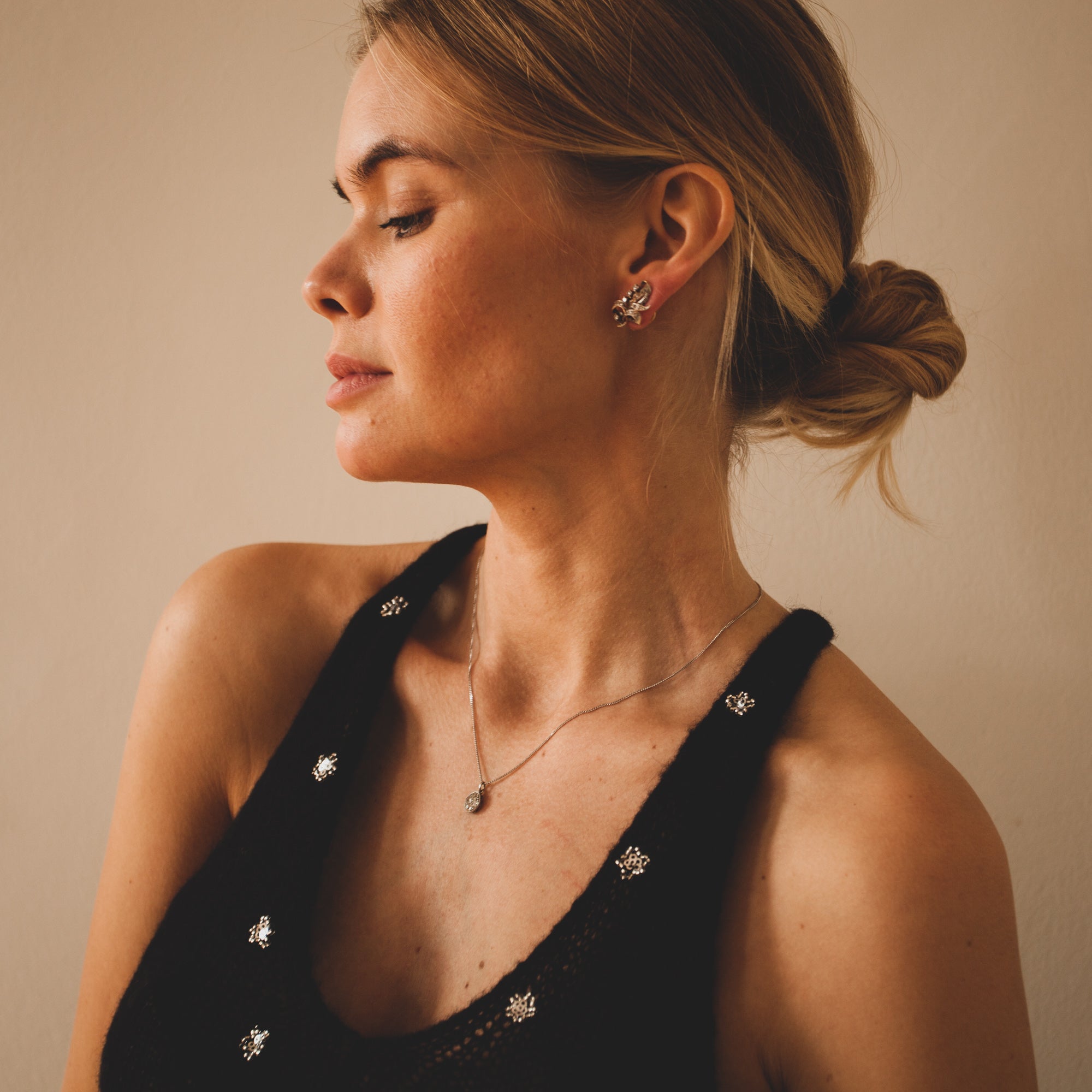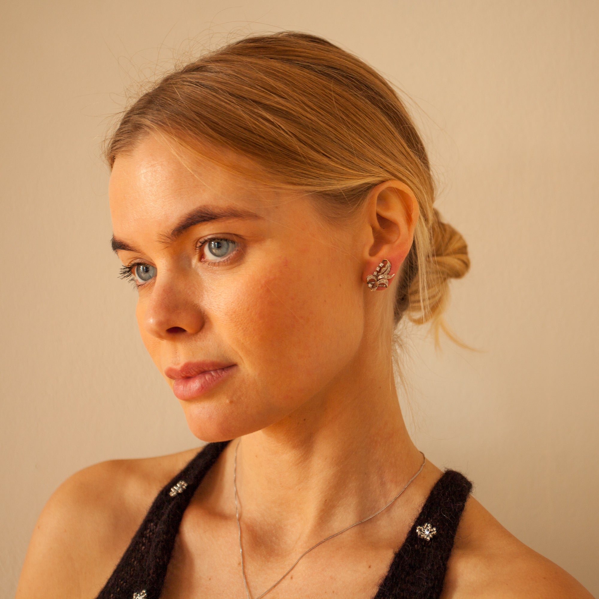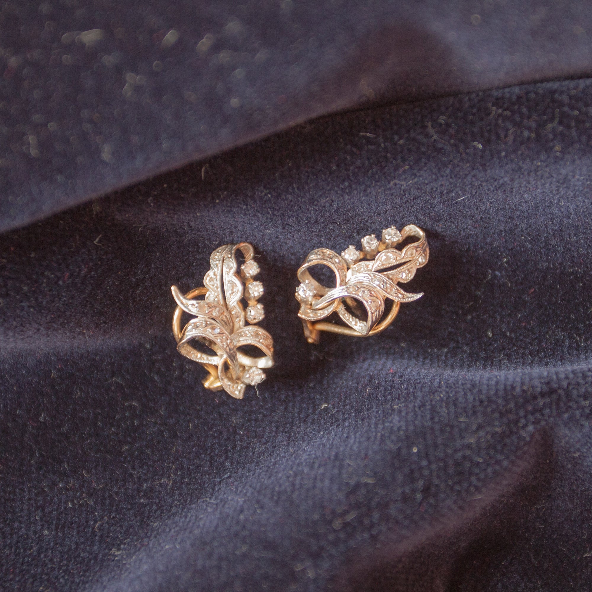 Antique 18k white and yellow gold antique earrings with curvilinear motifs decorated by eight 8/8 cut diamonds, total approximate weight 0.12 ct, and twenty-six rose cut diamonds, total approximate weight 0.31 ct. 5,6 gr. Omega closure.