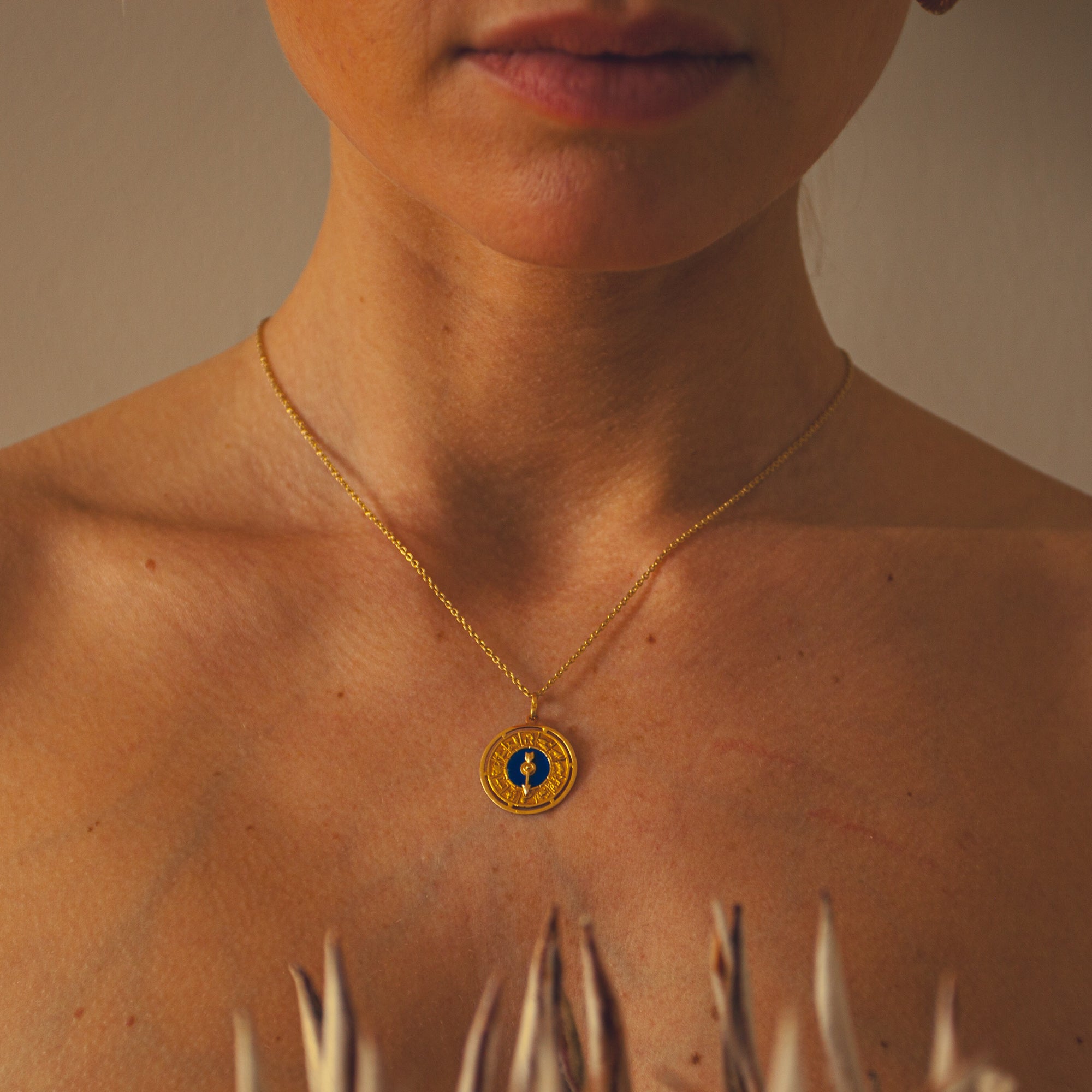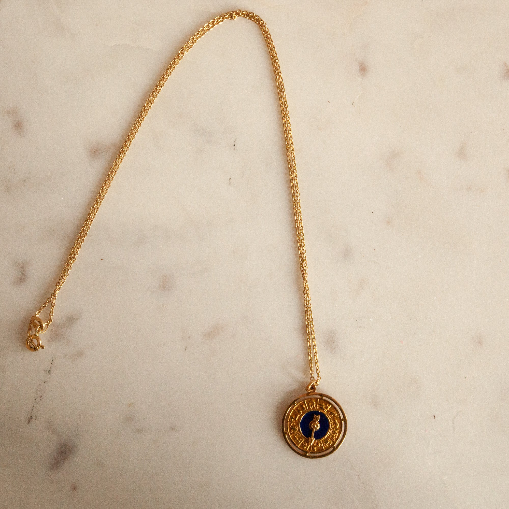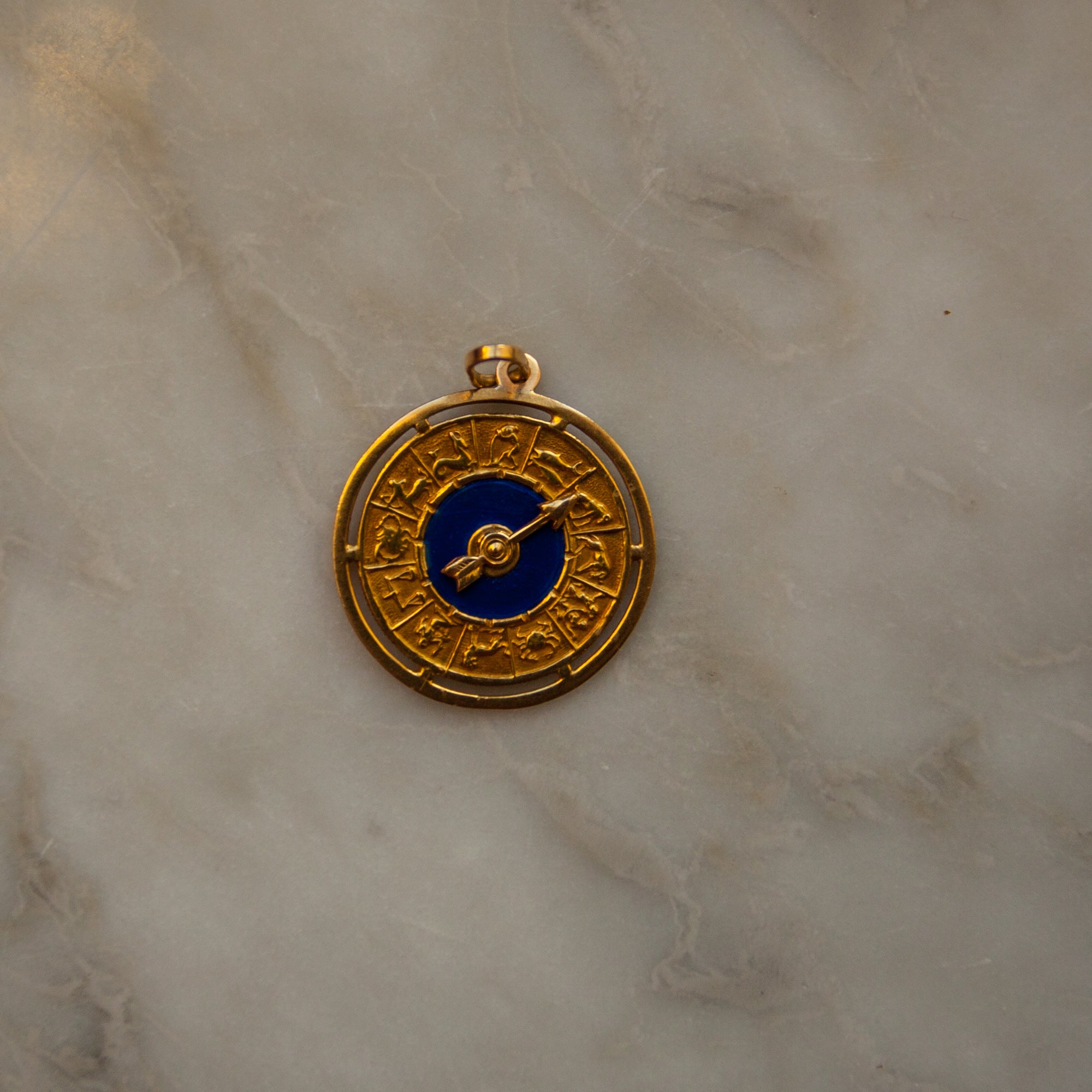 Vintage 18k yellow gold and enamel horoscope circle pendant. 2,5 cm. Weight: 2.20g.