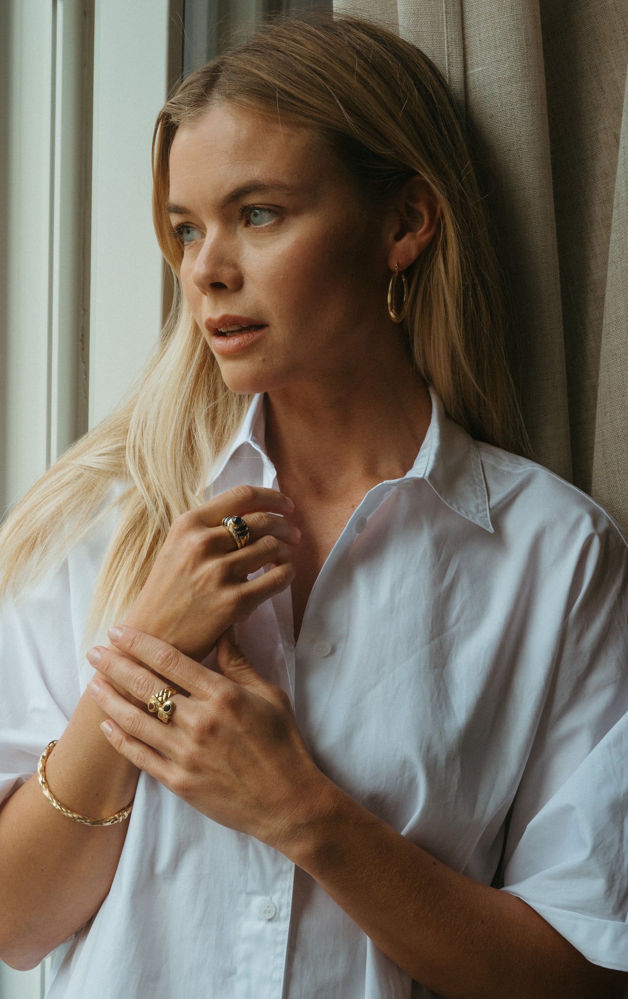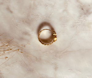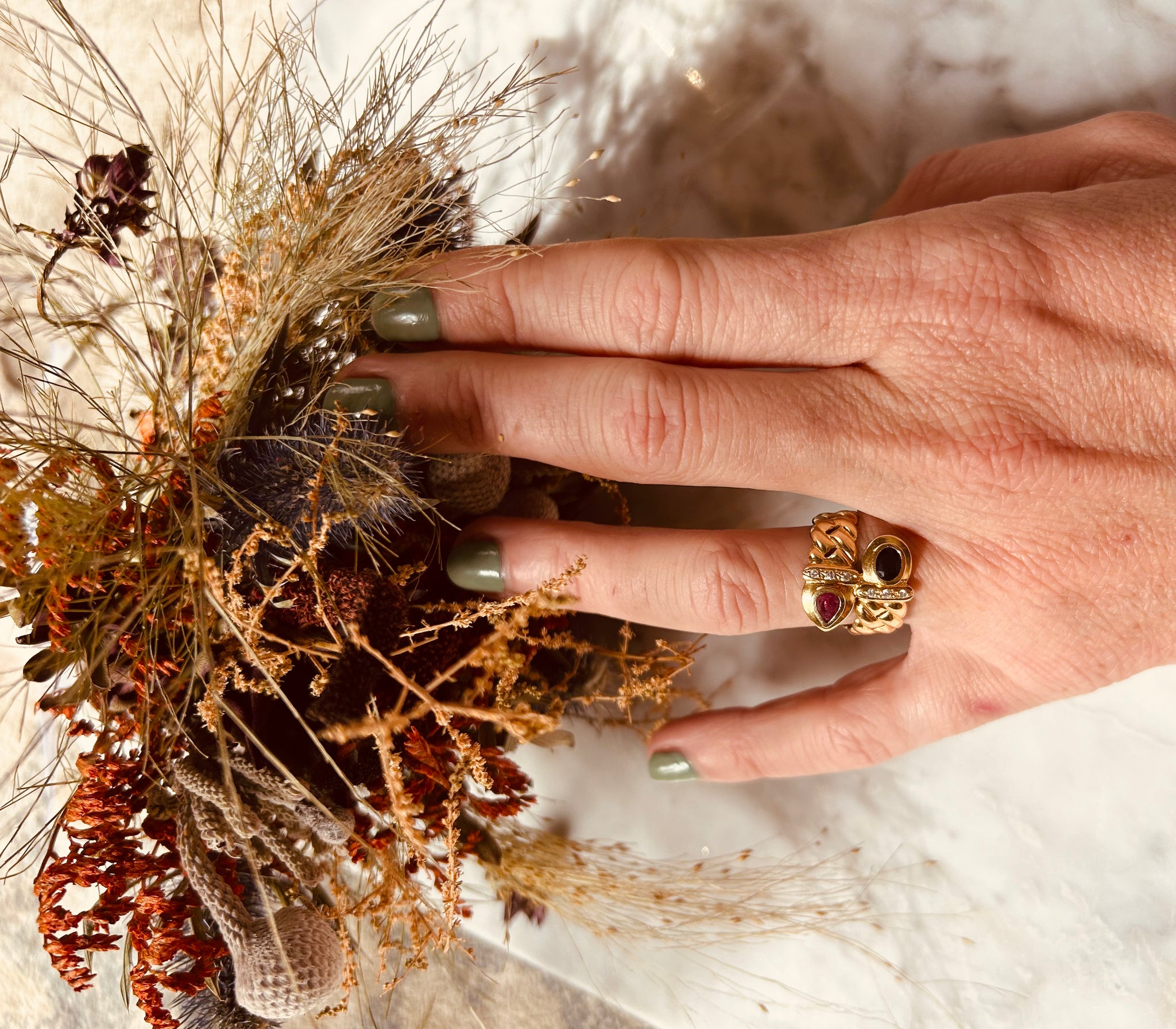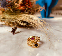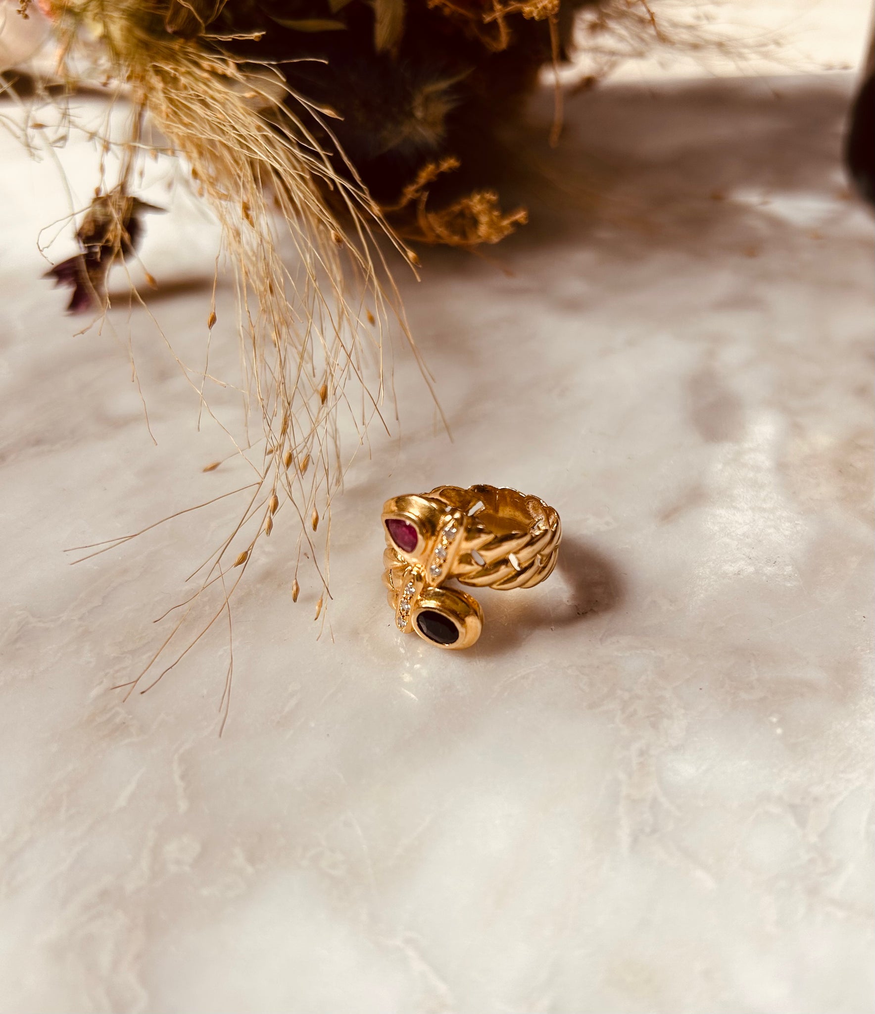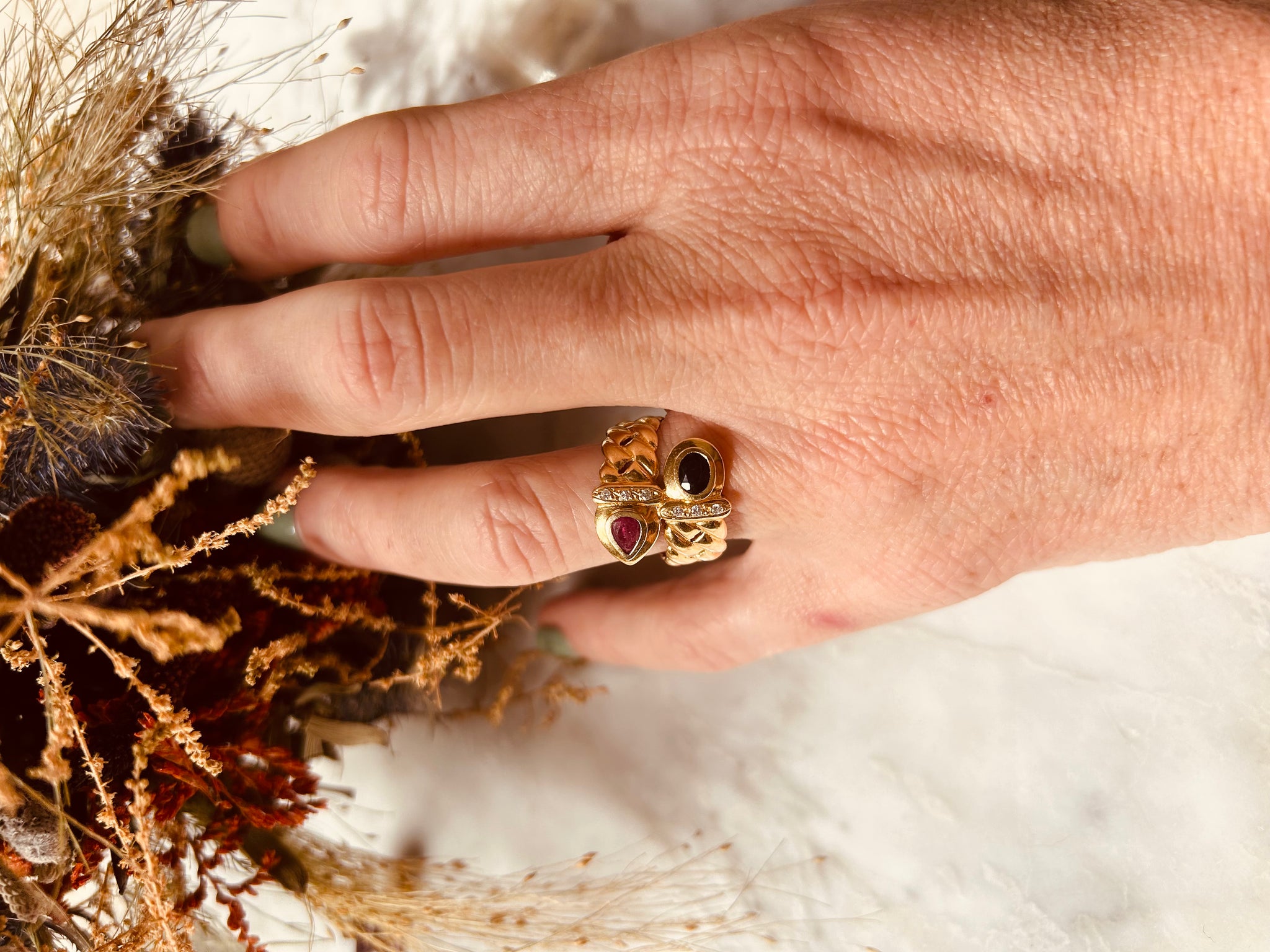 Indulge in the luxury and elegance of Maddalena. This "You and Me" gallon ring, crafted in 18k yellow gold with a pear-cut ruby, oval-cut sapphire, and six brilliant stones totaling 0.06ct, exudes sophistication and exclusivity. With its 54 french size setting and exquisite luster, this is the perfect piece to add to your collection.