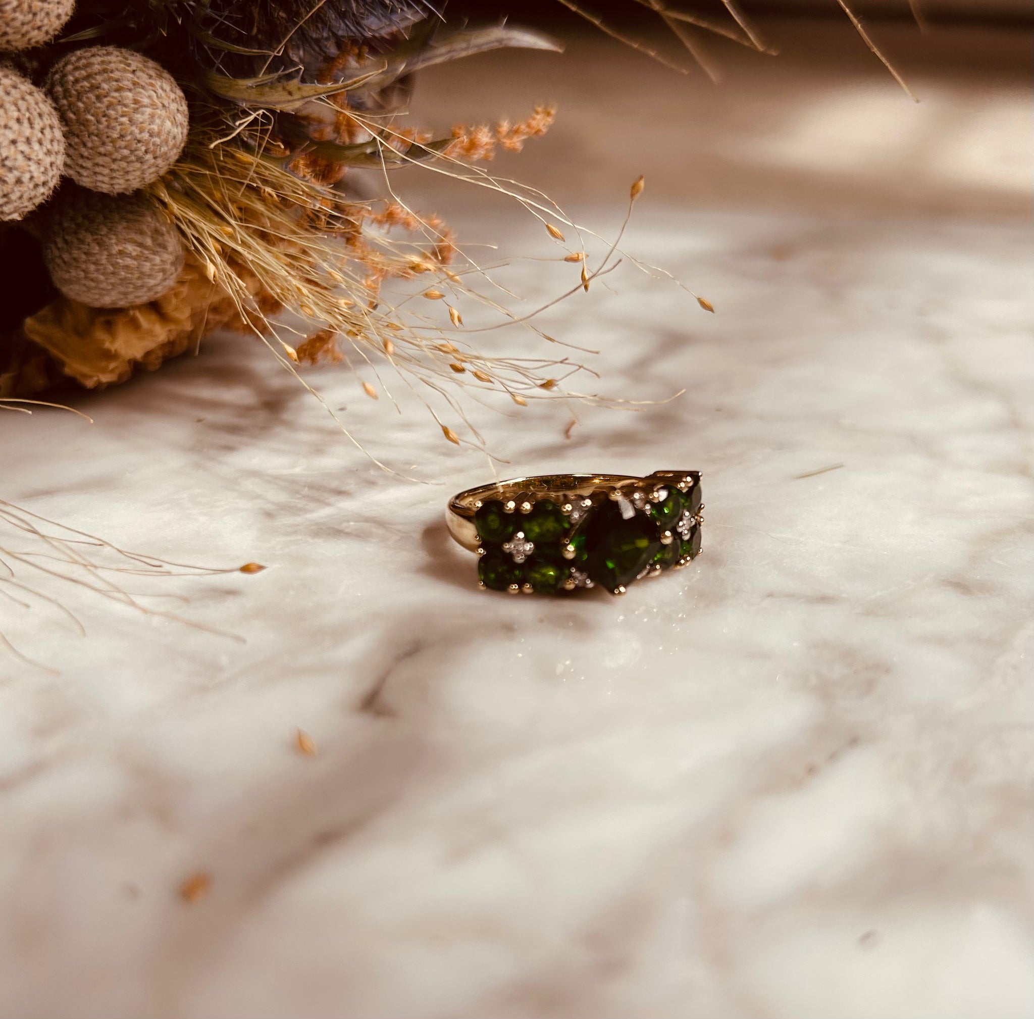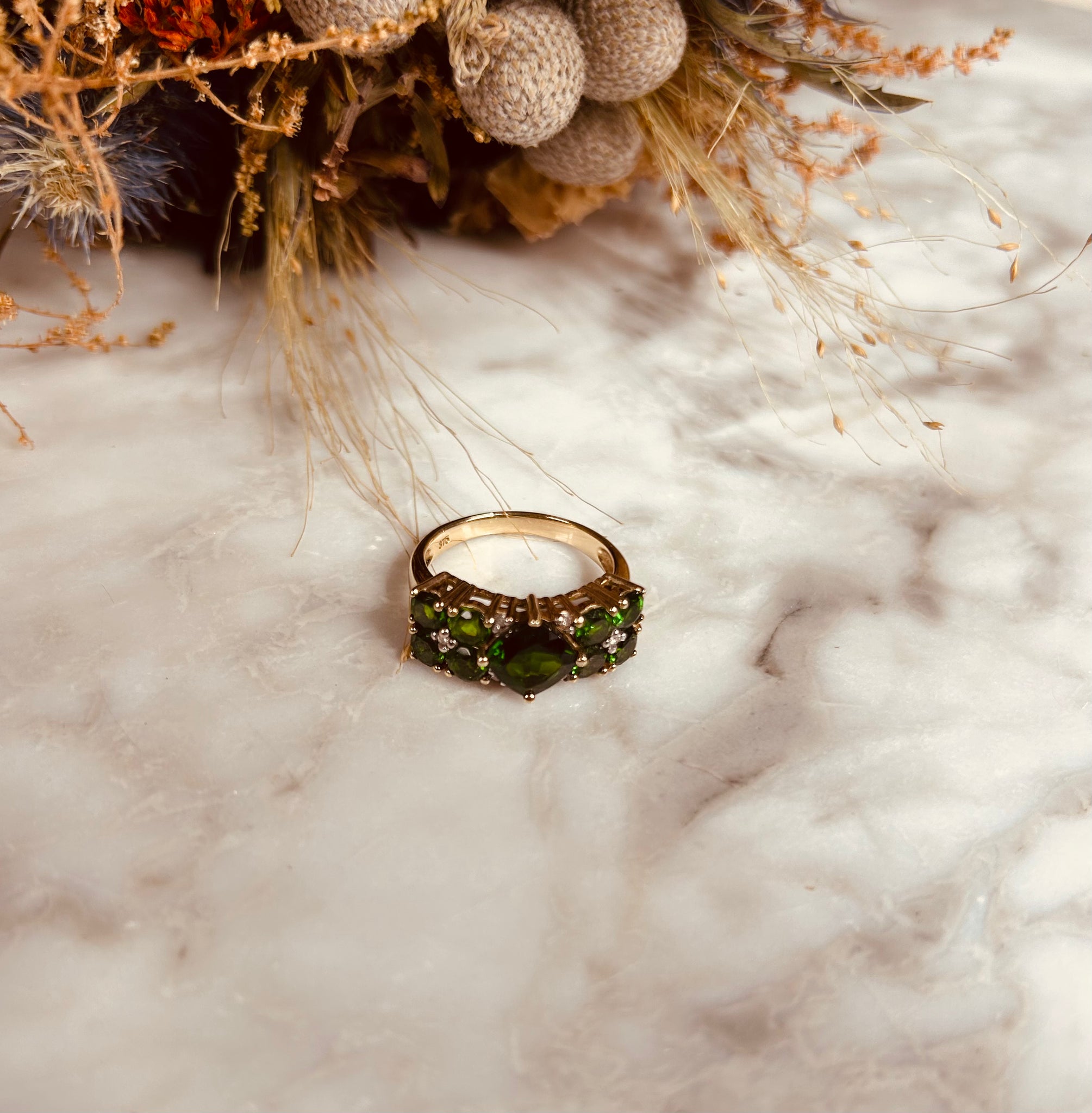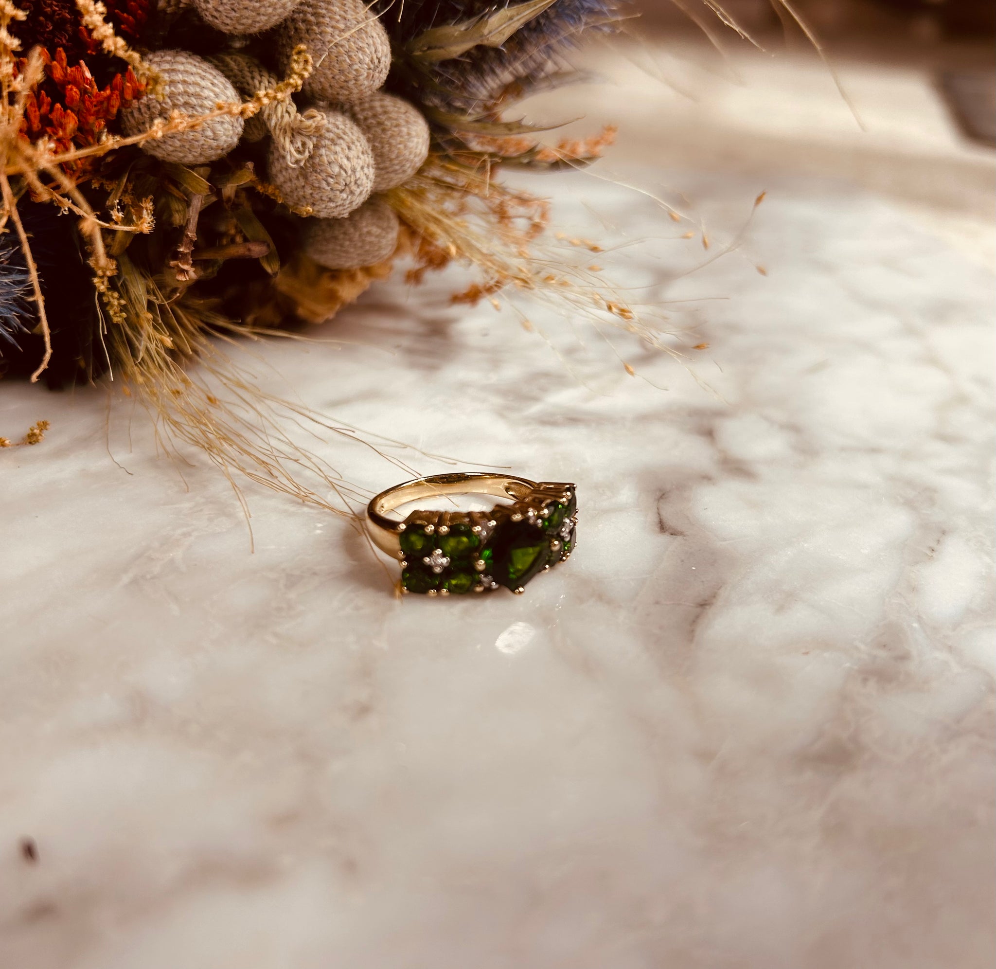 This exquisite piece of Montpellier, France jewelry-crafting artistry features a lustrous yellow gold band, bearing a singular, spectacularly-hued diopside at its center and eight smaller versions adorning its sides, all accented with six dazzling diamonds for a total carat weight of 0.05. This one-of-a-kind ring comes in a size 57.