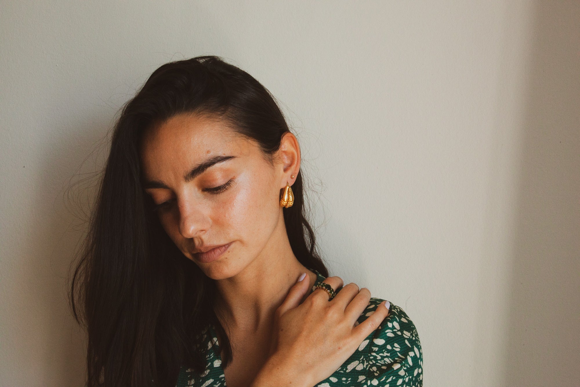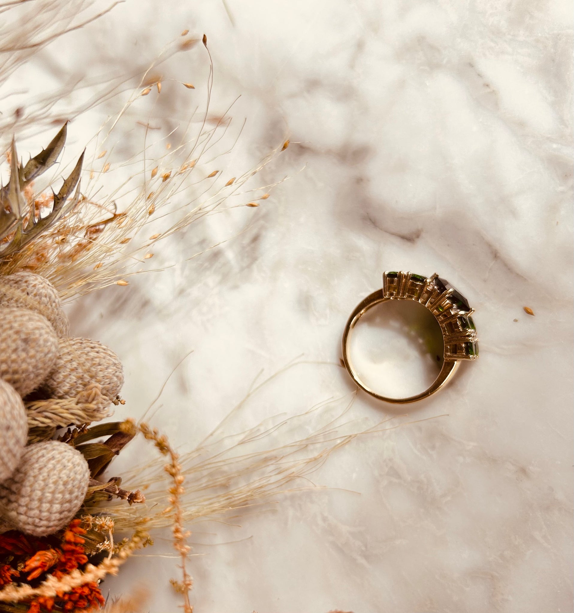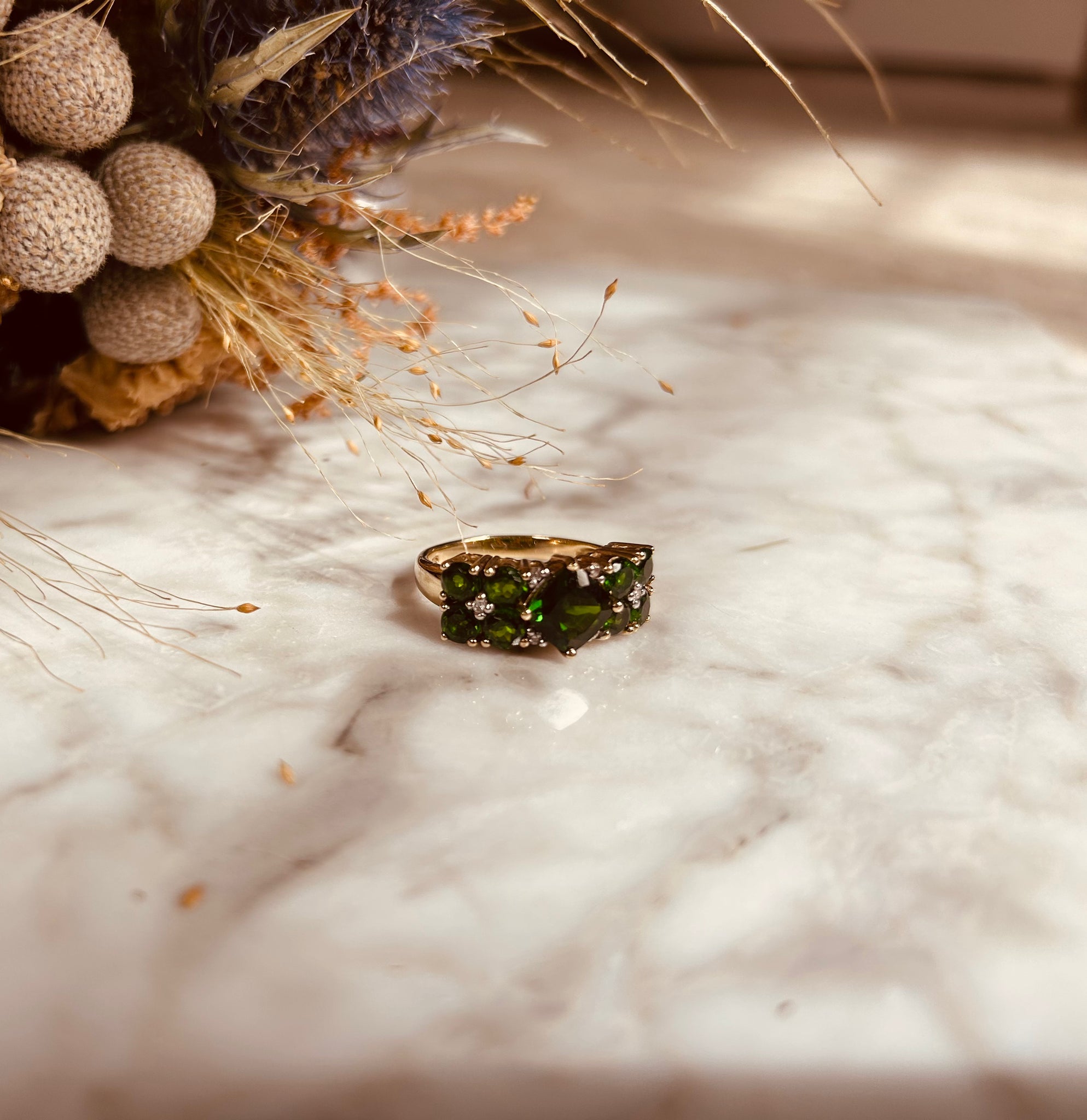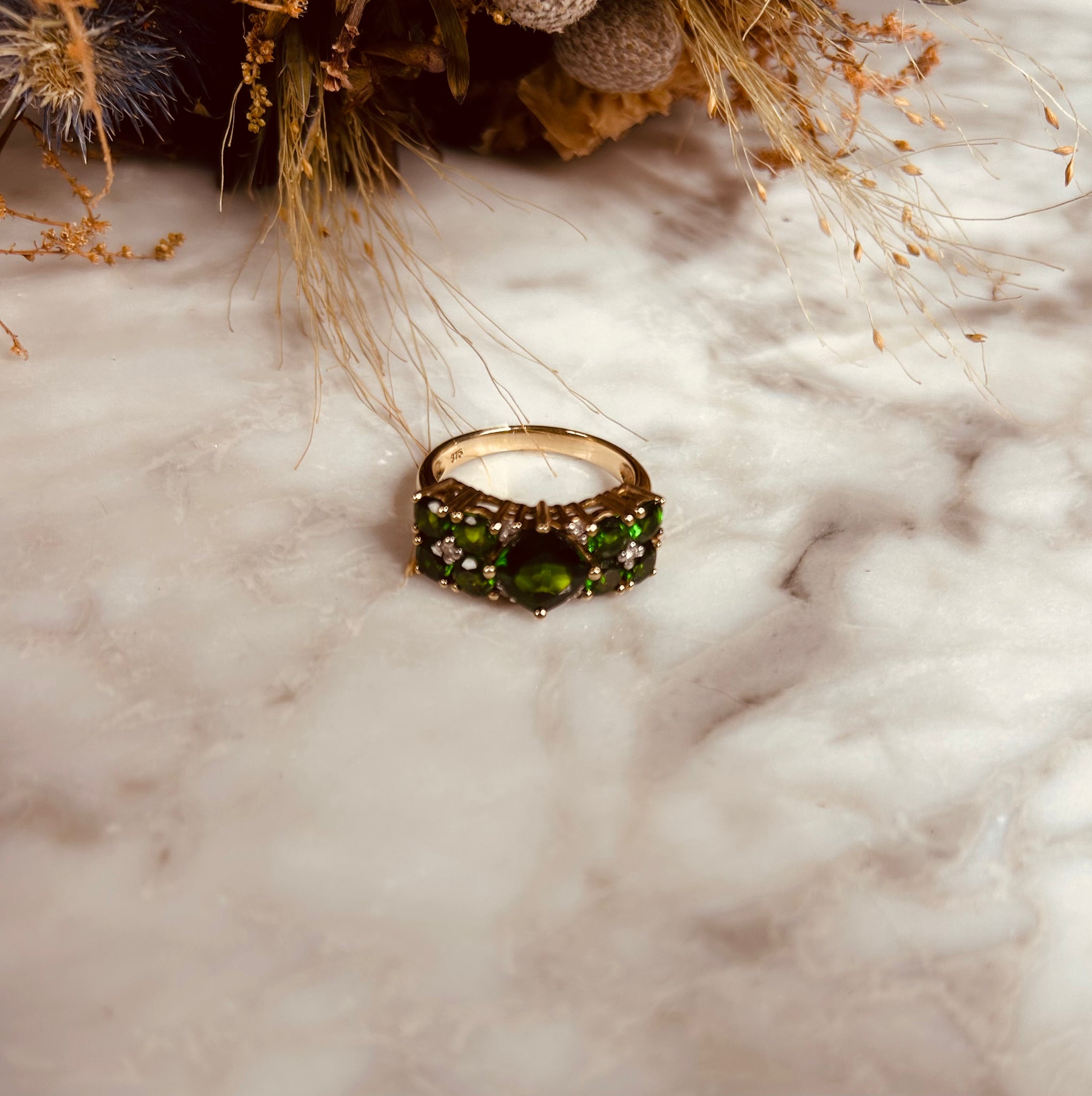 This exquisite piece of Montpellier, France jewelry-crafting artistry features a lustrous yellow gold band, bearing a singular, spectacularly-hued diopside at its center and eight smaller versions adorning its sides, all accented with six dazzling diamonds for a total carat weight of 0.05. This one-of-a-kind ring comes in a size 57.